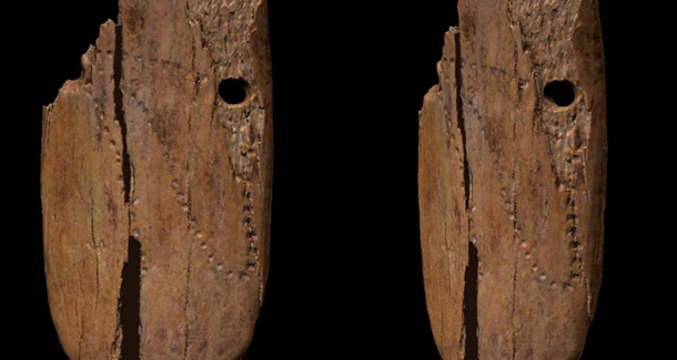 Ученые больше внимания сконцентрировали на подвеске. Она похожа на тонкую костяную пластинку толщиной 3,7 мм, длиной и шириной в несколько сантиметров. Подвесок полностью покрыта узором из окружностей и линий.